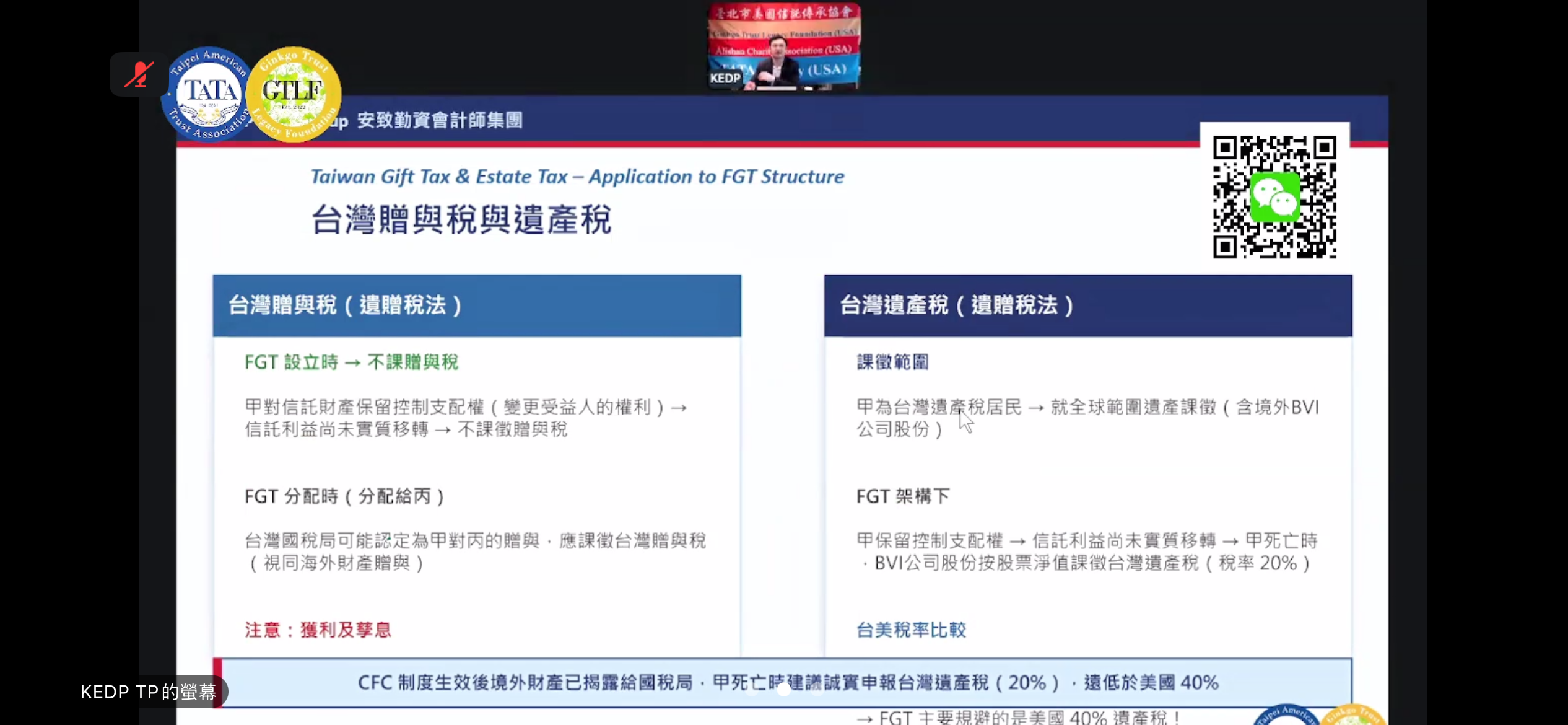 本系列講座由臺北市美國信託傳承協會與美國銀杏信託傳承基金會(Ginkgo Trust Legacy Foundation)主辦,並由 Alishan Charity (USA)及 TATA Charity (USA)協辦。特別邀請前臺北市國稅局稅務員、現任安致勤資集團許博升律師,以「FGT跨境稅務規劃案例解析」為題,深入探討如何運用委託人信託(FGT),協助高資產人士進行完善之跨境稅務規劃。誠摯邀請業界先進及高資產人士踴躍參與。