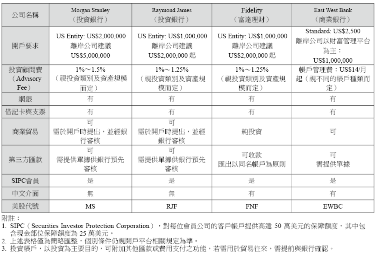 - 若想在美國進行證券相關投資,目前最有效率與方便的方式即是進行網路交易,可於下列比較表中選擇一個證券公司開立證券帳戶,原則上需準備下列資料: