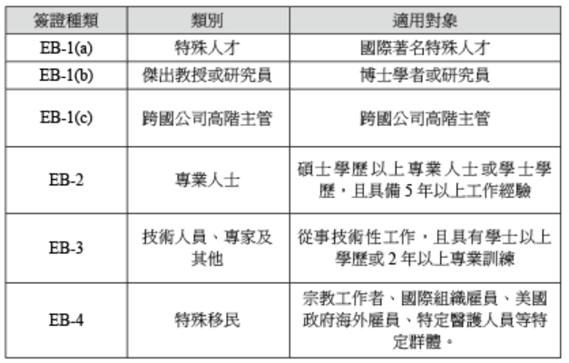 職業移民主要是吸引在專業技能、學歷或技術等方面特別傑出的人士移民美國,依其所具備不同的專業技能、學歷或技術等細分如下表: