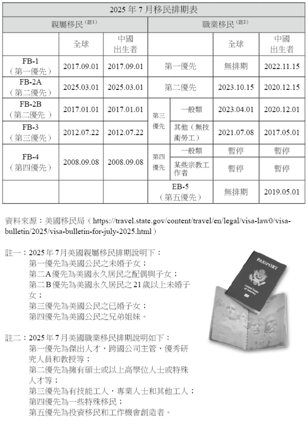 下一頁表格引用美國移民局公布移民排期表,供讀者參考。從此表可知,不論是親屬移民或是職業移民,都需要等上好幾年,相較之下,EB-5 的確是申請綠卡的捷徑,但由於近兩年中國大陸出生的申請 EB-5 投資移民人數急遽增加,過去不需要等待排期的 EB-5 投資移民申請也從 2015 年 1 月起約需等待 5 年的排期。