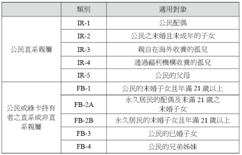 若在美國有親友已取得公民或永久居民資格(亦即取得綠卡),則可另外透過親屬移民的方式移民美國,依親友間的身分又可分為下述: