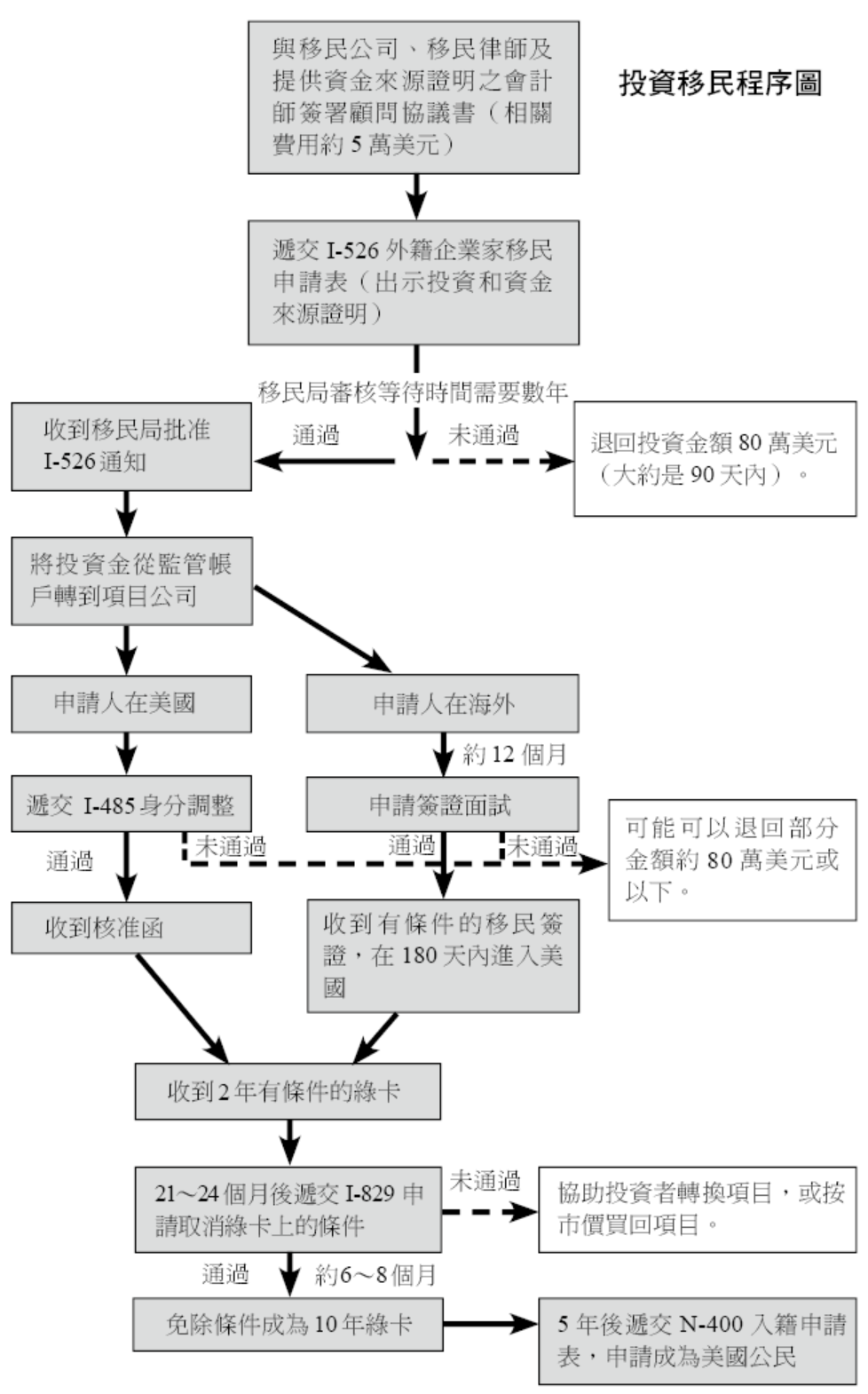 投資移民程序如前頁圖所示,供讀者參考(本圖僅針對一般狀況說明,實際投資退費時間及金額,根據所參與的投資案件不同及客戶個人情況而有差異,請客戶自行與移民公司確認)。