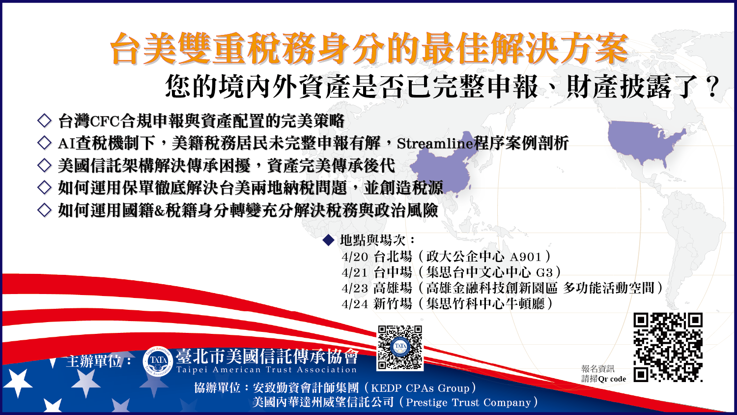 為協助高資產家族在快速變化的稅務與政治環境中,做好全面準備,台北市美國信託傳承協會特別舉辦本次研討會。講座將帶您: