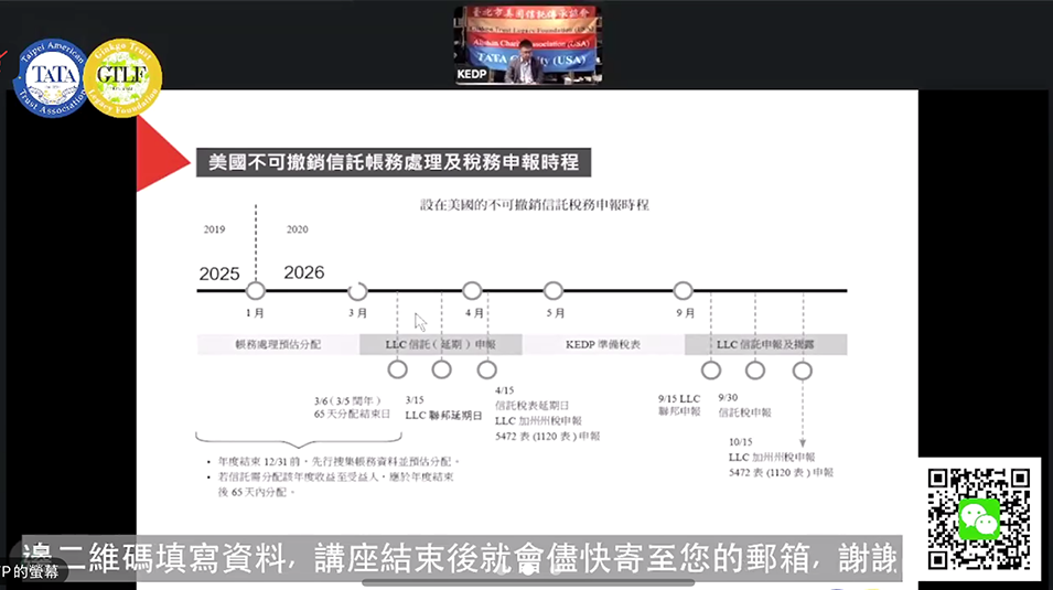 本系列講座由臺北市美國信託傳承協會與美國銀杏信託傳承基金會(Ginkgo Trust Legacy Foundation)主辦、Alishan Charity (USA)及TATA Charity (USA)協辦,邀請到安致勤資集團助理副總裁、美國註冊稅務師李博容(Timmy Lee),以「不可撤銷信託架構、合約問題與稅務申報相關流程」為題,深入剖析美國不可撤銷信託於高資產家族資產規劃中所扮演的關鍵角色,並說明設立時涉及之合約架構與相關稅務處理重點。