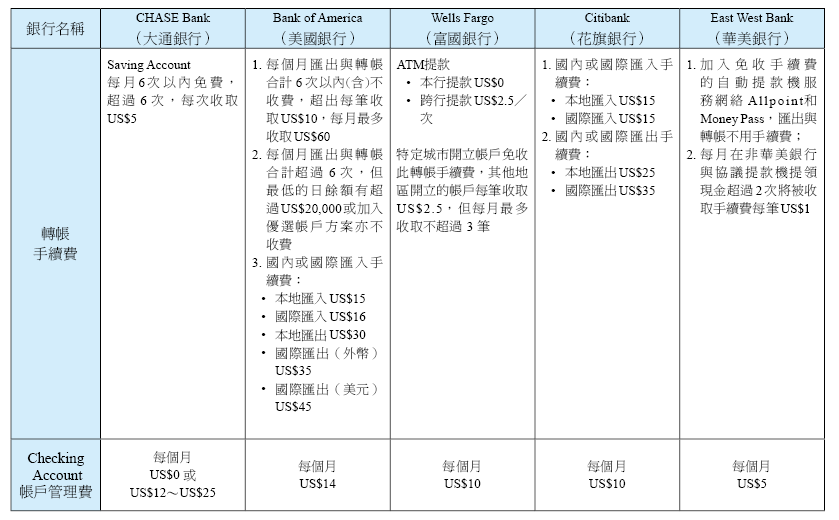 以下提供美國幾家大型銀行開立帳戶基本介紹予讀者參考: