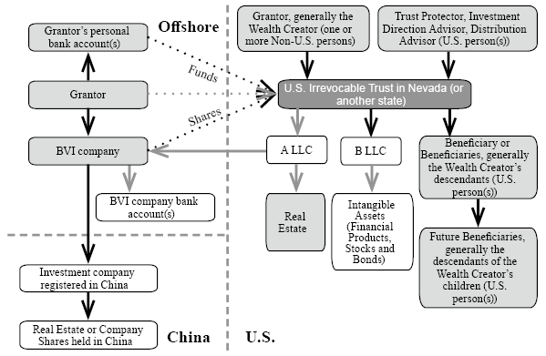 - The grantor transfers asset ownership into the U.S while the actual assets remain outside the U.S. By giving up the ownership of the asset, there will be no estate and income tax issues in the located country in the future.