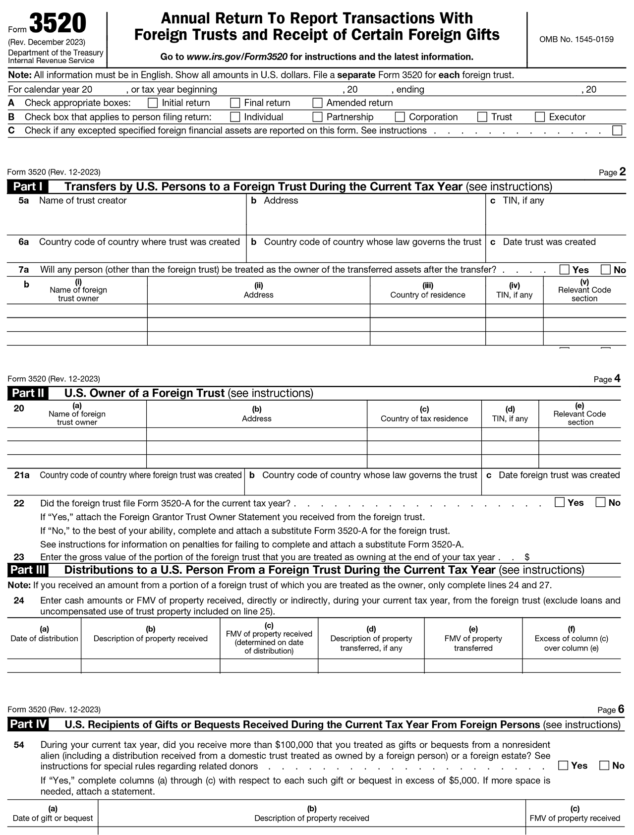 如果個人收到來自非美國人或外國信託之贈與總額超過10萬美元,則該個人需要提交此表。某些信託如果從非美國人處收到贈與時,可能也需要提交此表。