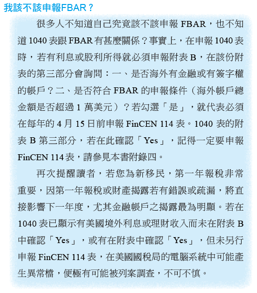 因 FBAR 的議題持續發展,基於專業立場,我們極度建議讀者若需申報 FBAR,應儘早與專業人士諮詢,以免滋生困擾或甚至產生牢獄之災。