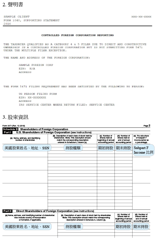 李先生及李先生父母因為歸屬判定關係被視為第四類及第五類申報者,根據美國稅局規定:「因歸屬判定而需要填報 5471 之美國人可由其中一人代他人填報」,因此李先生可以代為幫其父母填報 5471 表,李先生父母只要在自己的 1040 表中附上聲明書即可,填報時李先生需填寫自己以及父母的基本資訊,另外也要填寫該成衣廠的基本資料。