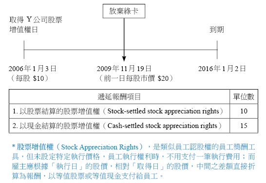 楊先生原是美國 Y 公司員工,這幾年在同窗好友的鼓勵下,興起回到大中華地區創業的念頭,加上已無家人居住美國,楊先生於是在 2009 年 11 月19 日放棄綠卡。Y 公司是一間美國生化科技公司,在 2006 年 1 月 3 日,曾經基於楊先生的工作表現,發放給楊先生10 單位「以股票結算的股票增值權(stock-settled stock appreciation rights)」和 15 單位「以現金結算的股票增值權(cash-settled stock appreciation rights)」。依照計劃,楊先生可以在 2006 年 1 月 3 日到 2016 年 1 月 2 日的這十年期間中任何時刻,選擇執行前面提到的股票增值權。