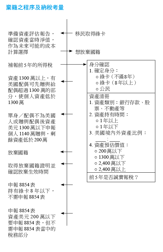 前已提及放棄綠卡必須完成的法律程序,除此之外,也應與會計師詳細討論稅務申報的部分,確保完成應有的申報。這裡的申報,除了在棄籍年度必須應規定申報美國所得稅表完成報稅義務之外,有些人的情況還應申報棄籍稅表,也就是 8854 表。