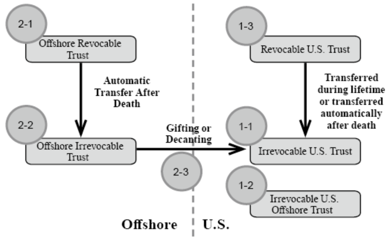Scenario 2-3: When the grantor of an offshore revocable trust gives directions or unfortunately passes away and the trust becomes irrevocable, there are negative tax consequences for the beneficiary (U.S. person) of the offshore non-grantor trust because the governing law for the trust is outside the U.S. When a trust has accumulated undistributed net income (UNI), the beneficiaries will be subject to Throwback Tax when they receive the trust distributions in that year; and foreign non-grantor trusts usually hold foreign financial instruments, such as mutual funds and money market funds, etc., there will be tax for the passive foreign investment company (PFIC) when the income from the asset is distributed in the future, so it is usually the accounting treatment and tax declaration for each year after the transfer of the offshore trust to the U.S. trust. Therefore, it is suggested to convert a foreign trust into a U.S. trust to solve the problem of annual accounting and tax filing.