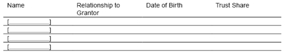 Generally, under this structure, if a beneficiary passes away with descendants, the beneficiary’s descendants would receive an equal share of that beneficiary’s share of the trust’s assets. If the beneficiary does not have descendants upon his or her death, the trust’s assets apportioned to that beneficiary would then be distributed among the beneficiaries’ siblings (or their descendants), per stirpes. Lastly, if the deceased beneficiary has no descendants or siblings upon his or her death, the assets apportioned to the deceased beneficiary would then be distributed among the deceased beneficiaries’ parents’ siblings (and their descendants), per stirpes, assuming that the deceased beneficiaries’ parents have already passed away.